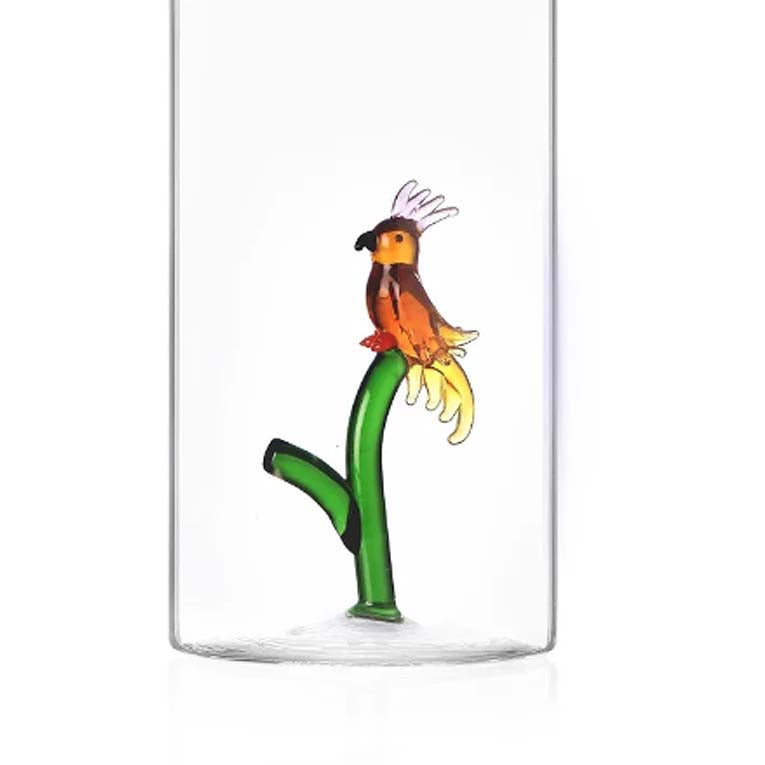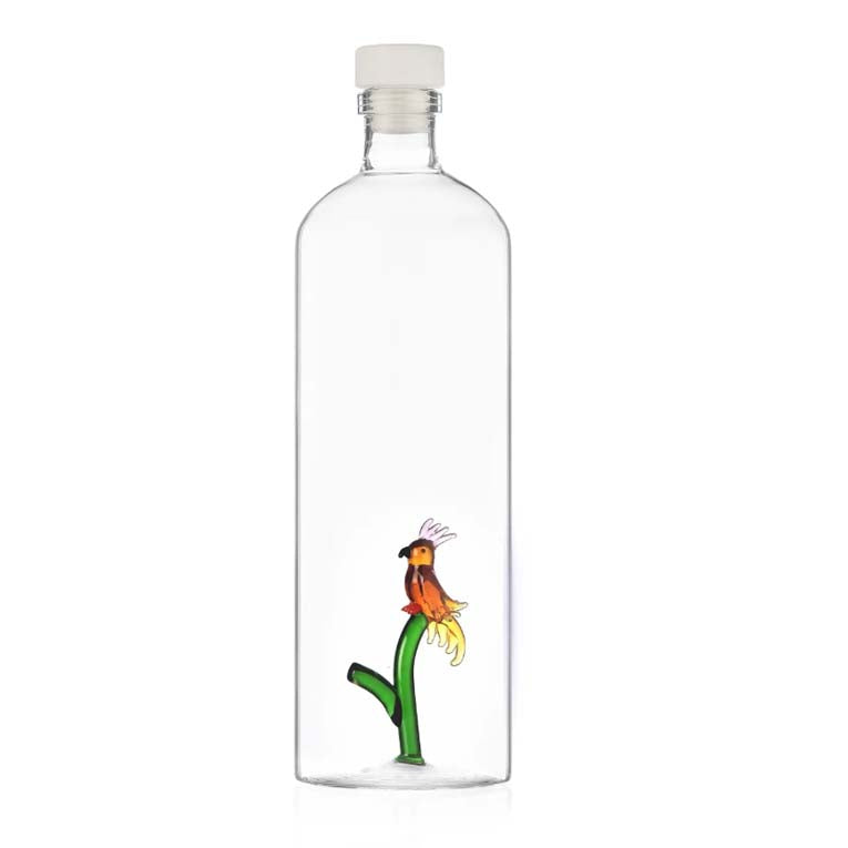 La bottiglia è realizzata in vetro borosilicato, un vetro artistico di alta qualità, leggero e resistente, al proprio interno è nascosto un bellissimo pappagallo soffiato.