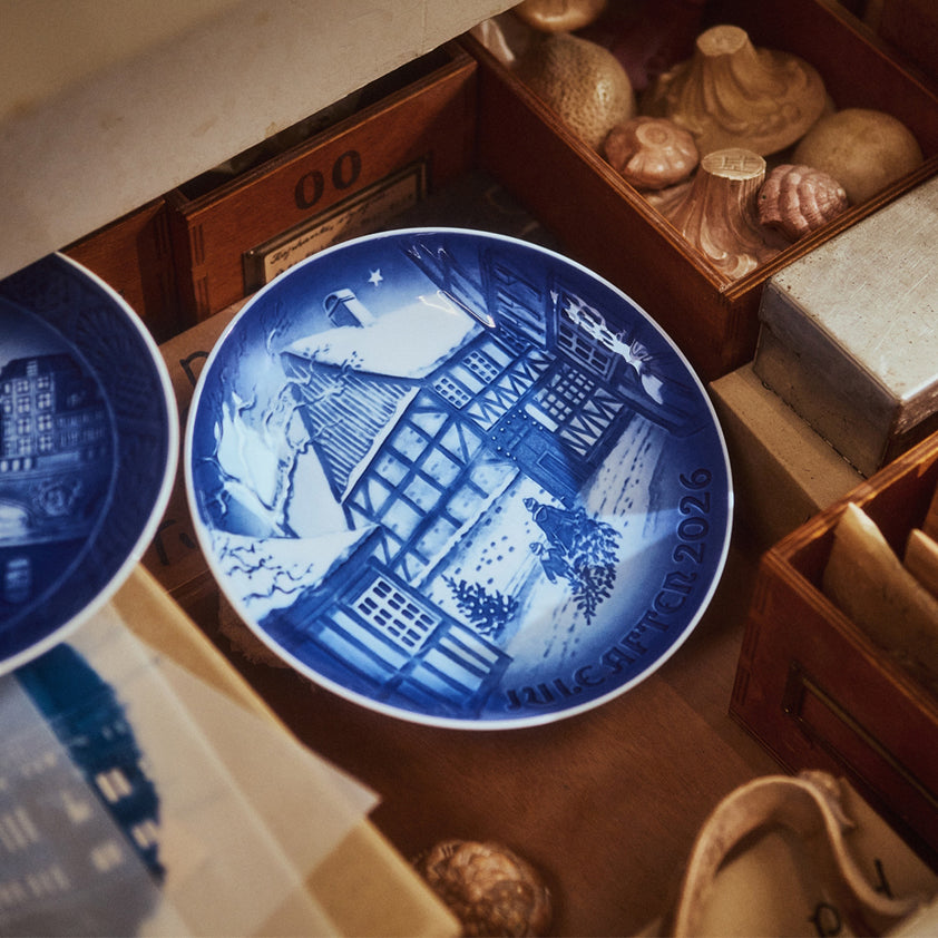 Il piatto natalizio Bing & Grøndahl di quest'anno presenta Den Gamle By ad Aarhus, un museo a cielo aperto che mostra elementi della storia e dello stile di vita danese a partire dal 1500. Il design dettagliato fa rivivere la storia danese con edifici innevati e strade acciottolate, dove un genitore e un bambino portano a casa un albero di Natale.
