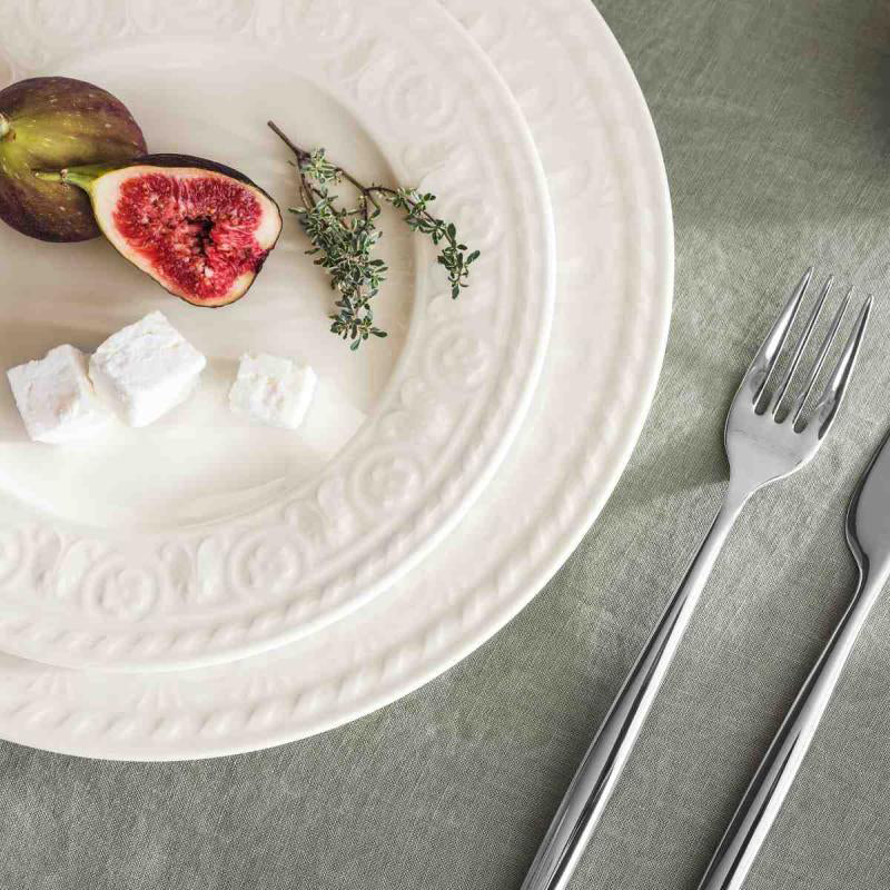 Cellini è un servizio tavola elegante e importante, i piatti alternano meravigliose greche in rilievo bianco su bianco, che conferiscono all'apparecchiatura un immagine lussuosa e rinascimentale.