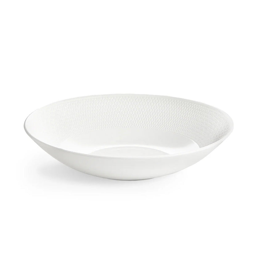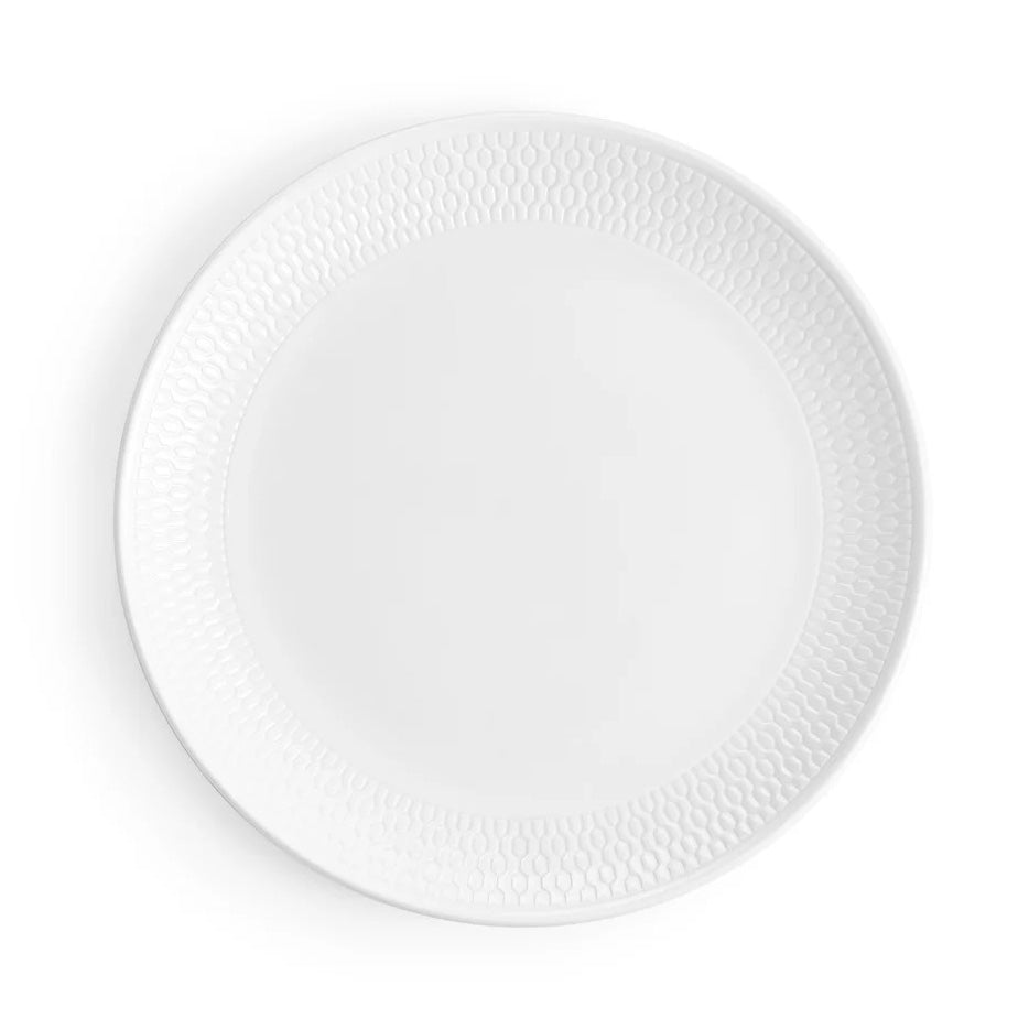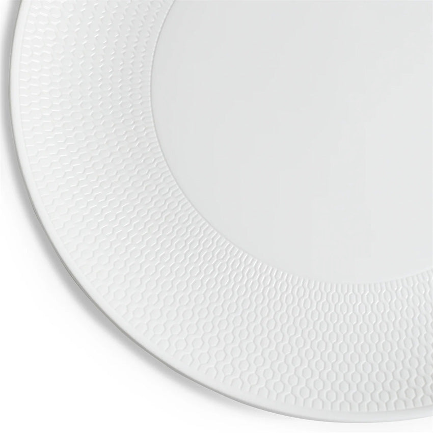Realizzato in pregiata porcellana d'osso per una resistenza superiore e una setosa traslucenza bianca, il bordo presenta un motivo a rilievo, perfetto come base neutra e moderna per le vostre deliziose pietanze.